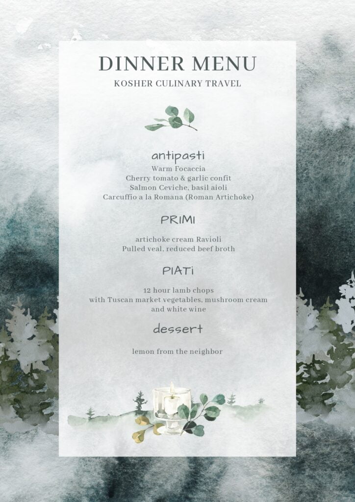 Traveling through Tuscany and can’t join our Kosher Tuscany vacation? We welcome you to join us for lunch or dinner! Chef Gili, will tease your palette with her seasonal menu, based on locally sourced ingredients.